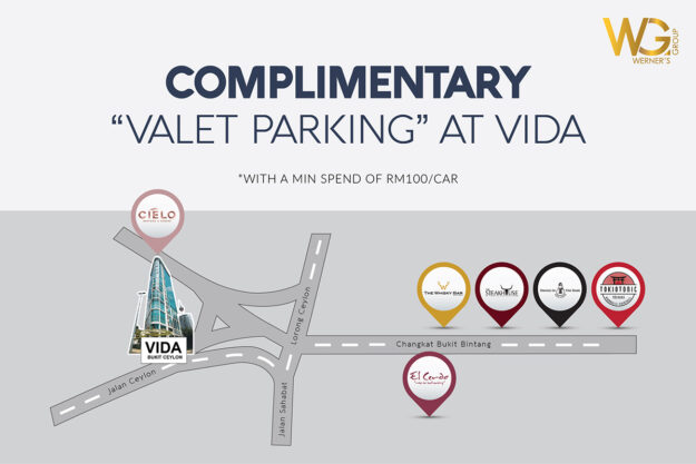 Complimentary Fully Sanitised Valet Parking at VIDA, Bukit Ceylon ONLY* *with a minimum spend of RM100/car *ticket must be validated by outlet staff *temperature checks on all parking attendants *parking attendants are equipped with face masks and gloves while handling your car *fully sanitised steering wheel prior to returning your car